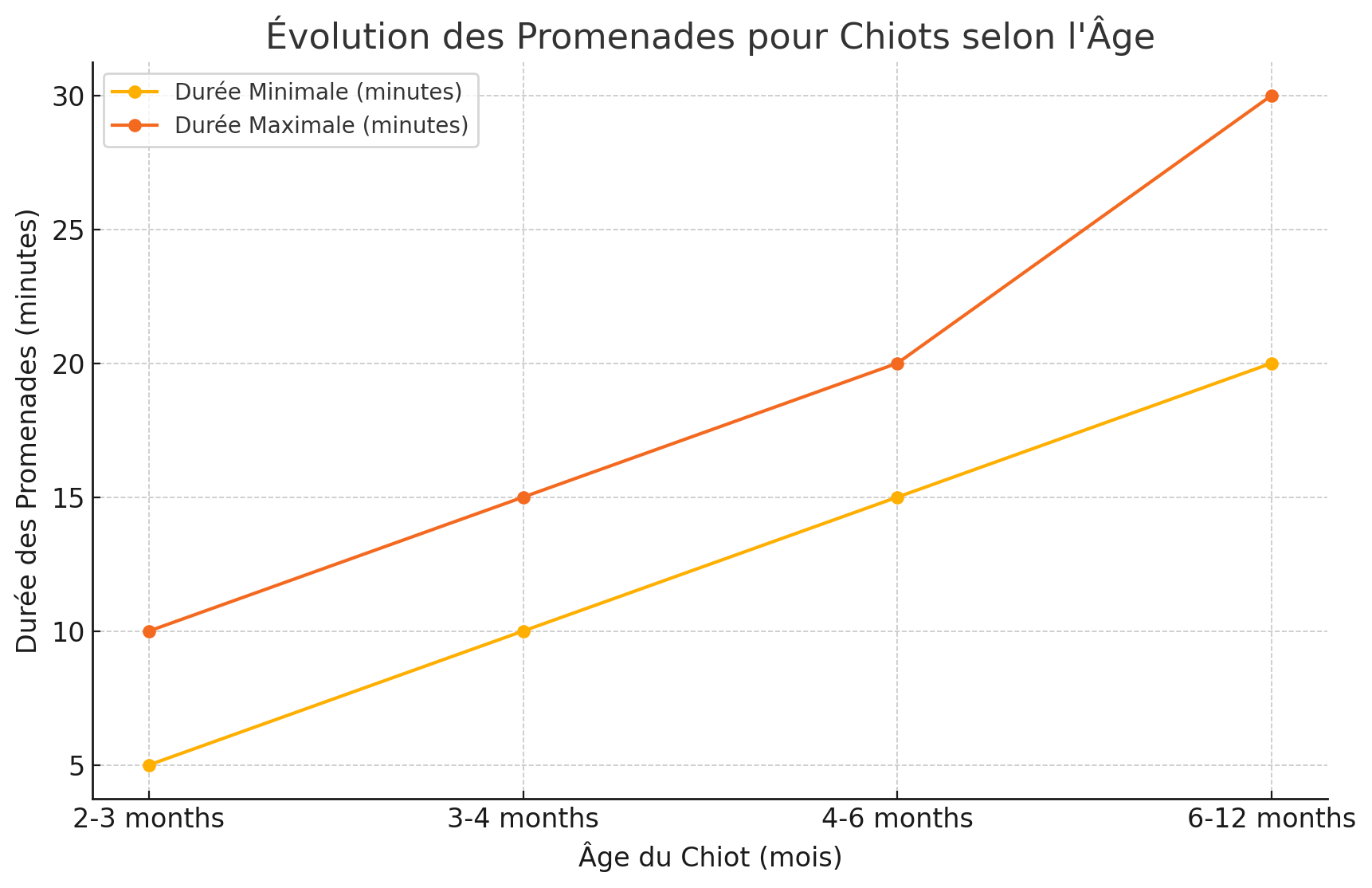 Donc une bonne rège de base est de prévoir 5 minutes de promenade par mois d’âge, si tu as 4 mois nous ferons plus ou moins 15 minutes.